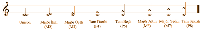 Aşağıda Do majör üzerinden verilen aralıkları çalışınız.
