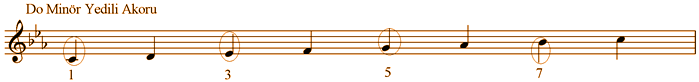 Sol sesinden minör üçlü aralık ilerleriz ve Si bemol sesini buluruz. Do Mi Sol Si seslerinden oluşur.