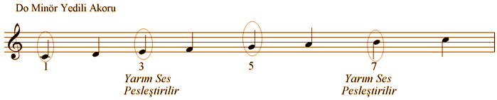 Not: Doğal minör gamından oluşturulan akorlarda, 5. derecenin oluşturduğu yedili akor yukarıda gösterildiği gibi minör yedili (v 7) olarak kullanılmasının yanısıra, birçok durumda dominant yedili (V 7) olarak da karşımıza çıkar. Bunun nedeni armonik yürüyüş kurallarındaki V 7---->i yürüyüşünün kullanılmasıdır. Dominant yedili akor olan V 7, karar akoruna (i) gitmek ister. Tam kadans denilen kadans türü de V 7---->i yürüyüşüdür. Bu konuyu iyi anlamak için daha kapsamlı bir armoni bilgisine sahip olmak gerekir. Bu metotta armoni konusunda ayrıntıya girilmeyecektir.