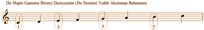 Böylelikle Do majör gamının 1. derecesinin yedili akorunun Do, Mi, Sol ve Si seslerinden oluşan Do majör yedili akoru olduğunu görürüz. Bu örnekten yola çıkarak da herhangi bir majör gamın 1. derecesinin yedili akorunun majör yedili akor olduğunu söyleyebiliriz.