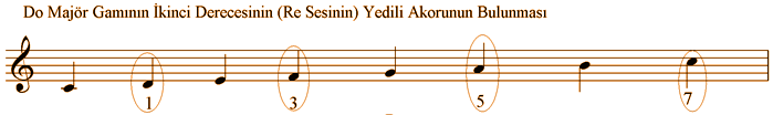 Böylelikle Do majör gamının 2. derecesinin yedili akorunun Re, Fa, La ve Do seslerinden oluşan Re minör yedili akoru olduğunu görürüz. Bu örnekten yola çıkarak da herhangi bir majör gamın 2. derecesinin akorunun minör yedili akor olduğunu söyleyebiliriz.