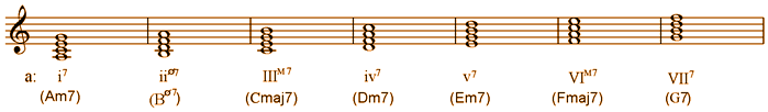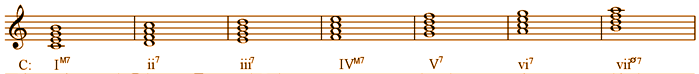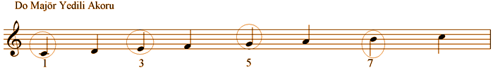 Bu şekilde devam ederek Do majör gamından elde edebileceğimiz bütün yedili akorları buluruz. Romen rakamlarıyla ifade edilmiş bu akorlar aşağıdaki gibidir: