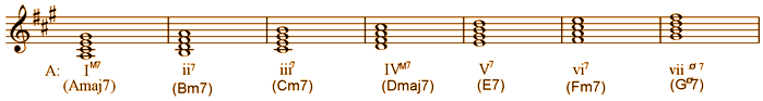 Aşağıda La majör gamından elde edebileceğimiz yedili akorlar yazılmıştır:
