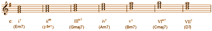 Aşağıda Mi minör gamından elde edebileceğimiz yedili akorlar yazılmıştır: